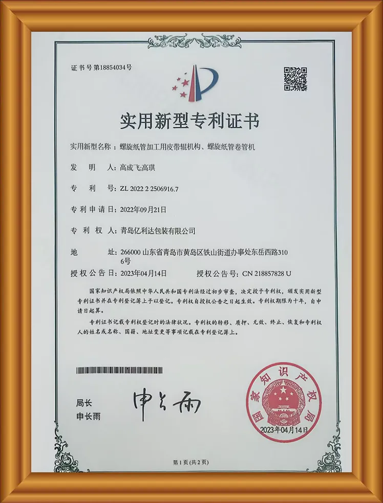ကျွန်ုပ်တို့၏ထုတ်ကုန်များမှာ FSC အသိအမှတ်ပြုခံရသည့် ISO9 အသိအမှတ်ပြုလက်မှတ်ရ, အထူးပြုစက္ကူပြွန်စက်ကိရိယာ, အထူးဆန်းသစ်သောအသေးစားနှင့်အလတ်စားစီးပွားရေးလုပ်ငန်းလက်မှတ်, Puni Testing နှင့်အရည်အသွေးပေးသွင်းလက်မှတ်များအပါအ 0 င်မူပိုင်ခွင့်ခုနစ်ခုပါ 0 င်သည်။